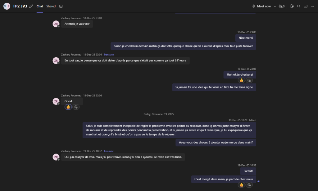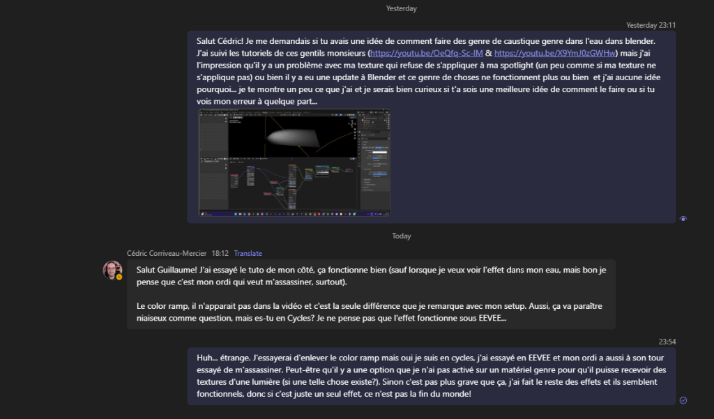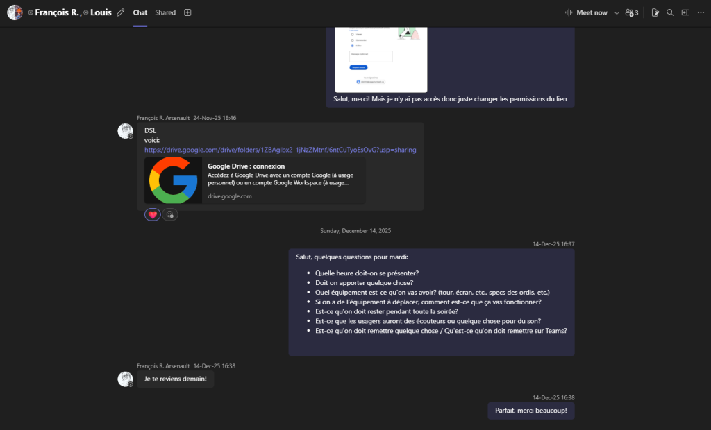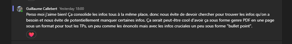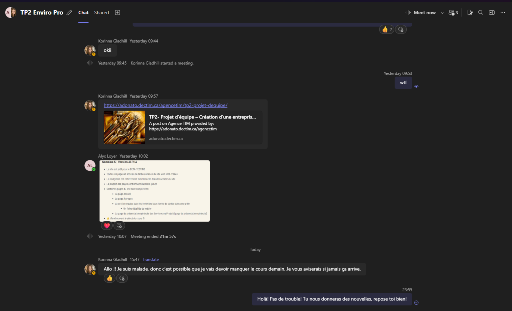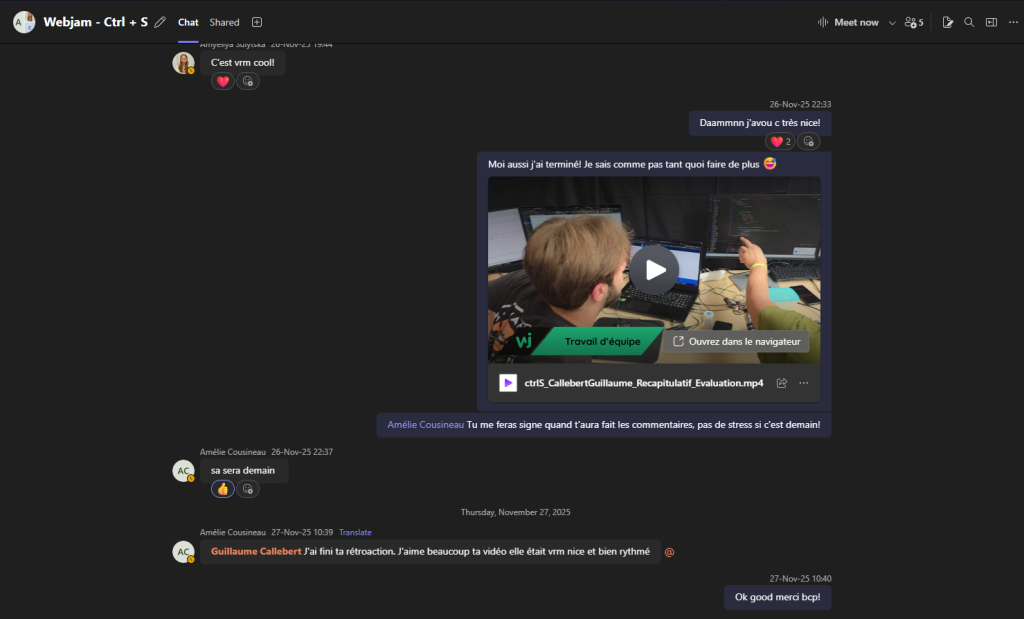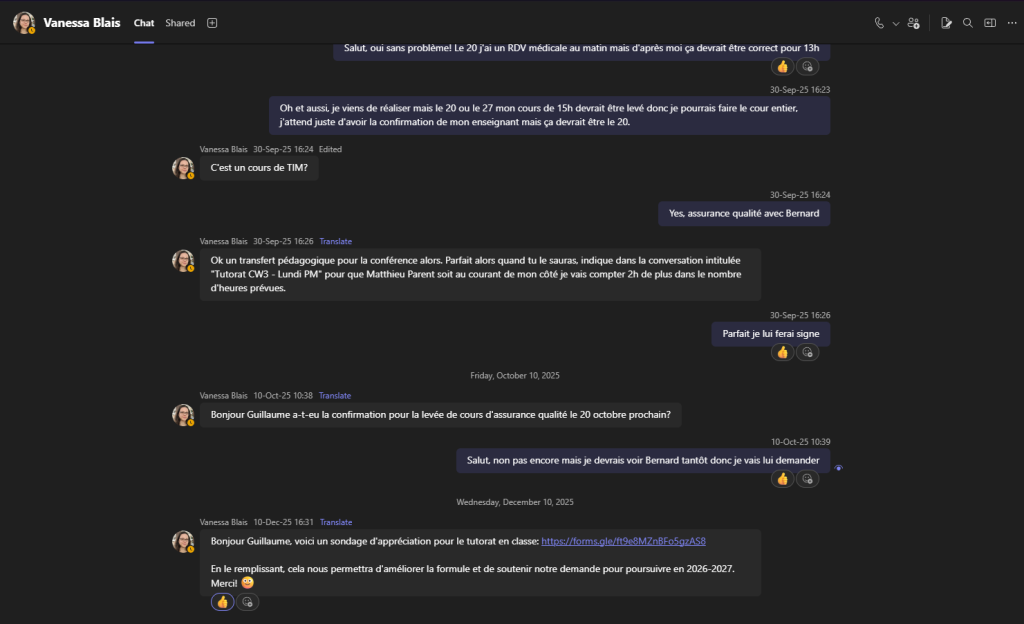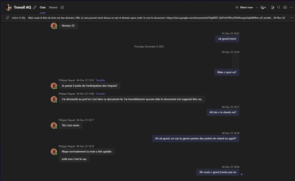 Ensuite, je crois que je suis quelqu’un qui communique quand même bien à l’écrit et au numérique, mais qui a parfois un peu plus de difficultés à structurer mes idées de manière claire à l’oral. J’ai souvent plusieurs choses que je veux dire en même temps et, à l’oral, il m’arrive de m’enfarger dans mes propres idées ou mes mots, ce qui nuit à la clarté de mes propos. En général, quand je communique sur une plateforme comme Teams, mon style de langage est plutôt professionnel, mais reste quand même un peu familier. Par contre, il varie beaucoup selon la personne à qui j’écris. Souvent, si je fais un projet avec des amis, j’utilise plus d’abréviations que je sais qu’ils vont comprendre, mais j’en utilise très rarement, voire jamais, avec des enseignants ou d’autres étudiants que je ne connais pas. Ainsi, je crois que mes améliorations seraient surtout nécessaires à l’oral, et que je devrais peut-être essayer de me faire un genre de bloc-notes pour prendre en note mes idées avant de parler, afin de déterminer si ce que je veux dire fait du sens et est pertinent ou non. Cette méthode pourrait ainsi m’aider à mieux structurer mes idées et, ultimement, aider mes collègues à mieux comprendre ce que j’essaie d’exprimer.
